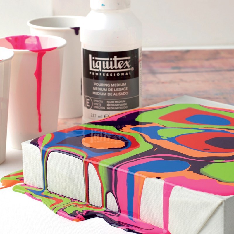 Il Liquitex Medium Pouring può essere utilizzato con qualsiasi colore acrilico e, una volta miscelato al colore, permette di creare un composto colorato molto fluido senza alterarne la tinta, ideale per realizzare opere d'arte multicolore dall'effetto a colata, marmoreo, con chiazze di colore e lisce, omogenee, senza screpolature o bolle d'aria. Il composto ottenuto può essere applicato su tutte le superfici (tela, cartone, vetro, e così via). Dopo l'asciugatura il prodotto rende il colore estremamente brillante e resistente all'acqua, oltre a conferire allo stesso un effetto bagnato (anche se in realtà è perfettamente asciutto).