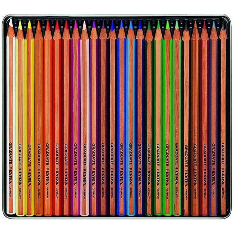 Set Matite Rembrandt Polycolor + Design di Lyra; contiene una grande selezione di matite colorate e di grafite di altissima qualità. Disponibile in una pregiata valigetta di legno scuro, dotata di una chiusura metallica e di un inserto in schiuma che protegge gli utensili. Ideale anche come elegante idea regalo.