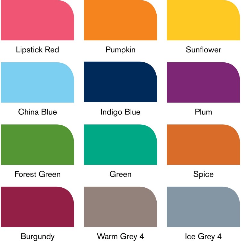 Lipstick Red, Pumpkin, Sunflower, China Blue, Indigo Blue, Plum, Forest Green, Green, Spice, Burgundy, Warm Grey 4, Ice Grey 4