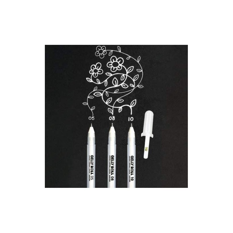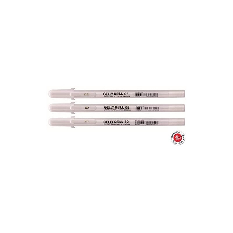 Confezione di tre Penne Gel Bianche "Gelly Roll" by Sakura, set composto dai 3 bellissimi tratti di Gelly Roll ovvero Fine 0.3mm, Medio 0.4mm e Grosso 0.5mm.