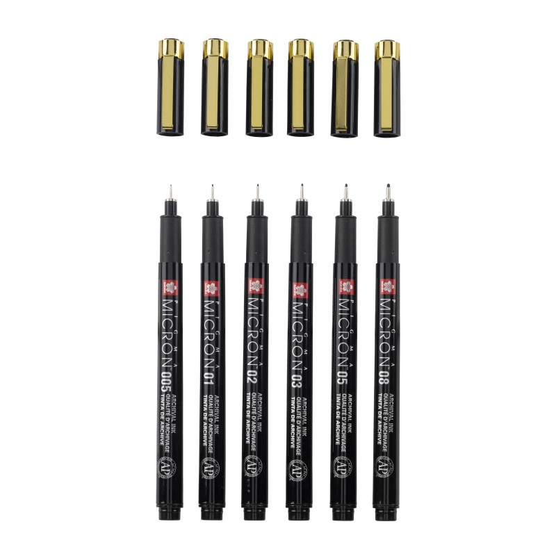 Set di 6 penne nere Pigma Micron. Le penne Pigma Micron sono fineliner impermeabili e permanenti che vengono utilizzati fedelmente da designer, scienziati, archivisti, artisti manga, fumettisti, illustratori e hobbisti.