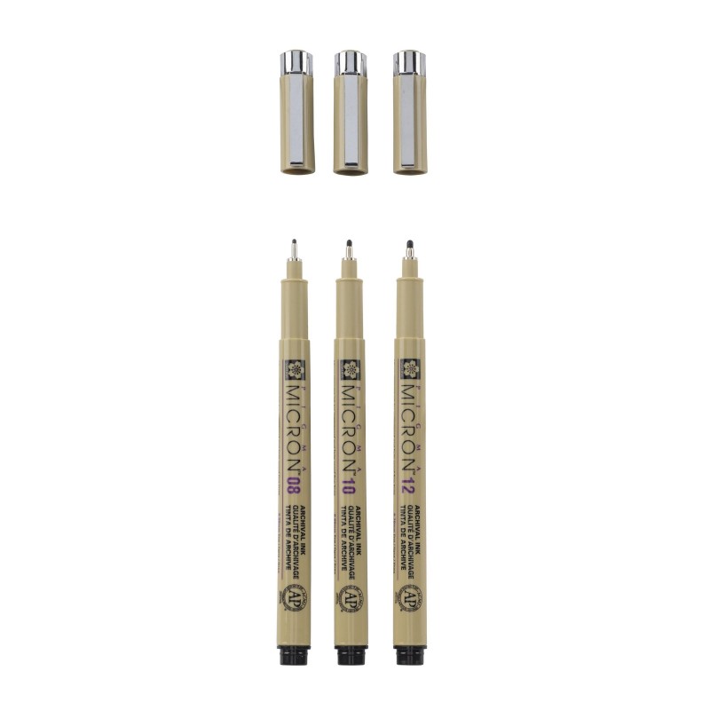 Set di 3 penne nere Pigma Micron. Le penne Pigma Micron sono fineliner impermeabili e permanenti che vengono utilizzati fedelmente da designer, scienziati, archivisti, artisti manga, fumettisti, illustratori e hobbisti.