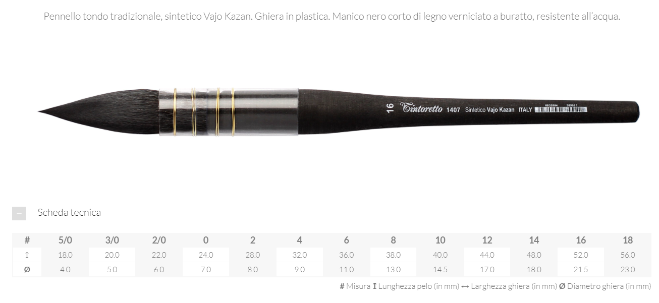 Pennello dal design tradizionale rivisitato in chiave moderna. Possiede le caratteristiche più evolute sotto ogni aspetto. È concepito appositamente per soddisfare le estreme esigenze dell’acquarellista moderno: punta molto sottile, alta capacità di tenuta del colore e apprezzabile elasticità. Grazie alla particolare tensione esercitata dalle singole fibre, riesce a trattenere tutta l’acqua e colore al suo interno, di modo che non perda gocce. L’aspetto più importante di questo pennello è senza dubbio la sua versatilità: eccellente sia nella stesura delle linee più fini che quelle più spesse, garantisce assoluta precisione e pulizia del tratto poiché segue perfettamente la pressione data dalla mano. Impeccabile stesura del pigmento che risulta sempre omogenea e costante. Quando scarico, questo sintetico è in grado di assorbire tutte le eccedenze di colore.