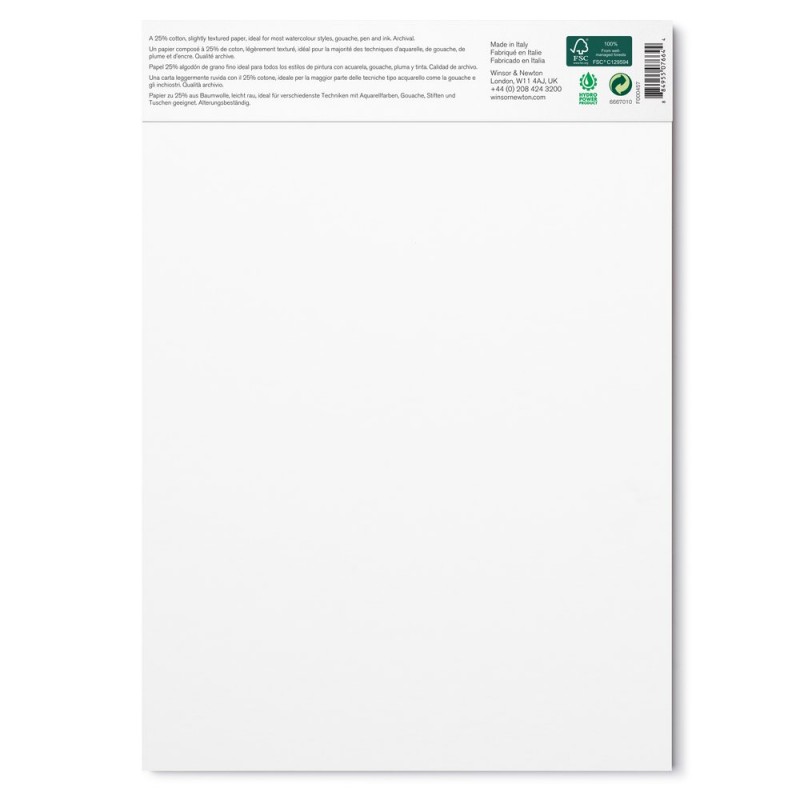 La carta per acquarelli di Winsor & Newton viene prodotta in Italia da esperti nella fabbricazione di carta per le belle arti. Una carta 25% cotone leggermente testurizzata a grana fine, qualità archivio. Le fibre vengono sottoposte a collatura in superficie e “à coeur” e poi trattate per garantire alla carta una capacità di assorbimento ottimale e una straordinaria resistenza alle deformazioni (anche se satura di acqua o di più strati di colore). Questa carta a base di cotone, priva di acidi e di sbiancanti ottici, offre un candore naturale e brillante di qualità archivio, che non ingiallisce né si degrada con il tempo. La carta viene realizzata impiegando energia idroelettrica al fine di limitare le emissioni di gas serra e a partire da una polpa certificata FSC al fine di proteggere le foreste. L’eccezionale rapporto qualità prezzo fa di questa carta un supporto ideale per studenti, principianti e artisti amatoriali che desiderano affinare le loro tecniche e sperimentare. Ideale per l'uso con acquarello, gouache, matite e inchiostro.