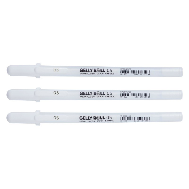 Confezione di tre Penne Gel Bianche da 0.5mm "Gelly Roll" by Sakura. Colore luminoso e intenso che non sbiadisce mai ideale per Lettering, Fumetto e Illustrazione a 360 gradi.
