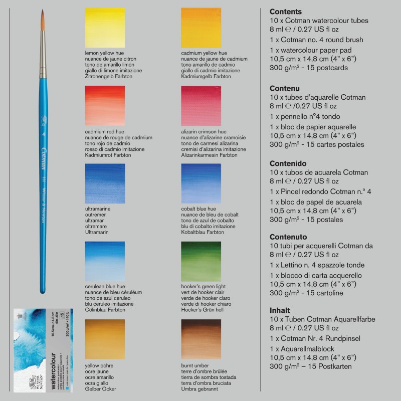 10 acquerelli Cotman in tubetti da 8ml. (Giallo di Limone imitazione, Giallo di Cadmio imitazione, Rosso di Cadmio imitazione, Cremisi d’Alizarina imitazione, Oltremare, Blu di Cobalto imitazione, Blu Ceruleo imitazione, Verde di Hooker chiaro, Ocra Gialla, Terra d’Ombra bruciata);
