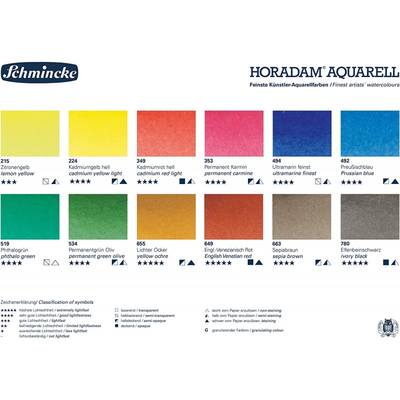 Gli acquerelli professionali Schmincke Horadam (made in Germany) godono della massima reputazione in tutto il mondo e sono garanzia della migliore qualità.