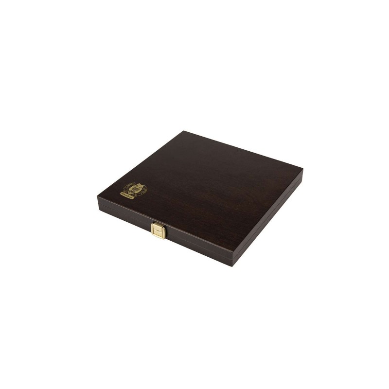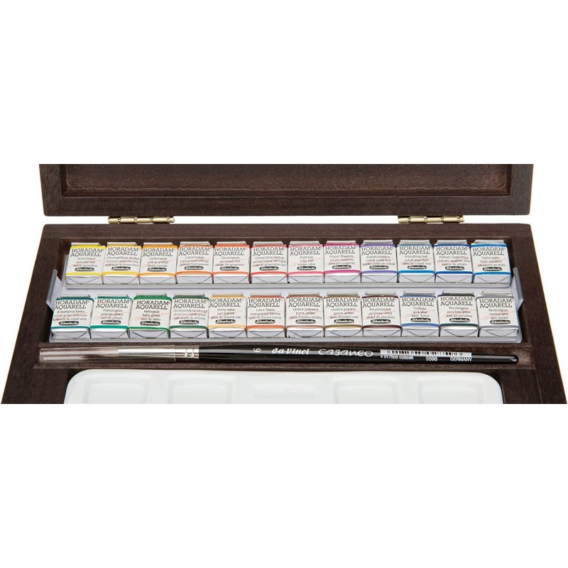 Cassetta in legno scuro in edizione limitata con acquerelli Schmincke Horadam e accessori di alta qualità: l'elegante scatola in legno con logo Schmincke color oro contiene 24 mezzi godet, una grande tavolozza in porcellana, un pennello per acquerello Da Vinci Casaneo misura 6 e una Horadam Dot Card con altre 12 tonalità da conoscere.