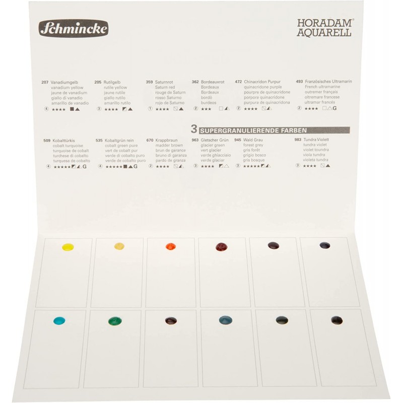 Gli acquerelli professionali Schmincke Horadam (made in Germany) godono della massima reputazione in tutto il mondo e sono garanzia della migliore qualità. L’altissima qualità dei pigmenti e la gomma arabica Kordofan utilizzata come legante permettono una stesura del colore unica e rendono l'acquerello Horadam Schmincke un top di gamma. Tutte le tinte sono mixabili tra loro ed hanno un carattere intenso e vivace.