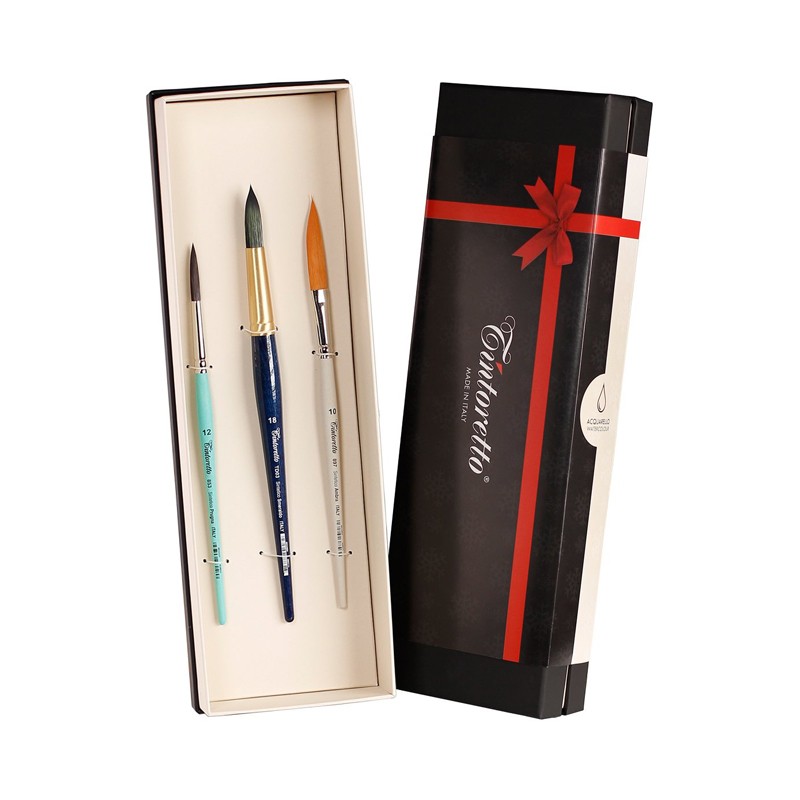 Elegante scatola composta da tre pennelli, accomunati da uno studio accurato e da materie prime top quality, questi pennelli sono gli strumenti indispensabili per ogni professionista nel settore dell’acquerello.