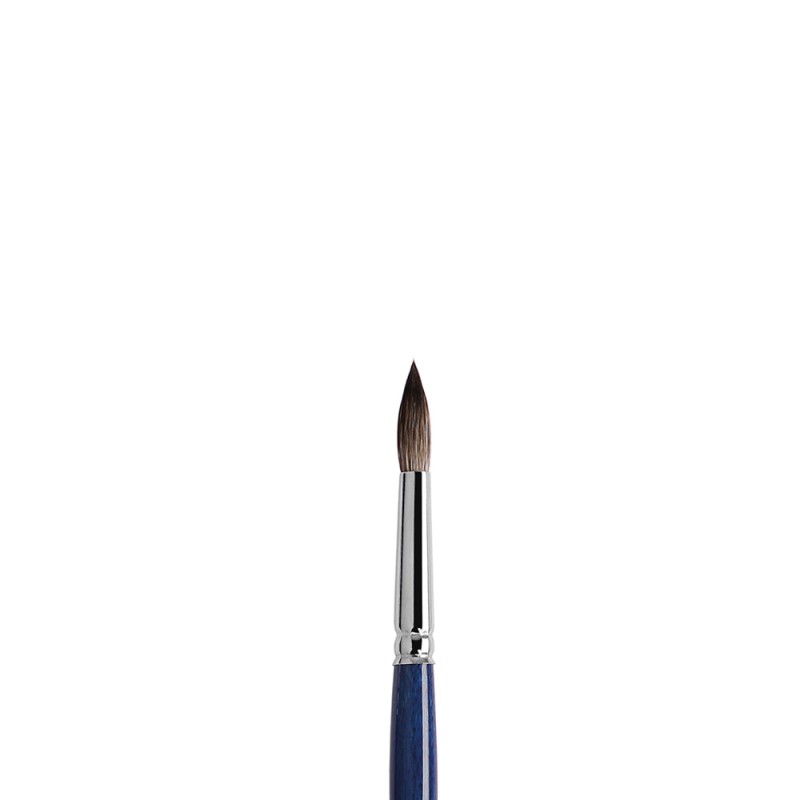 Pennello a punta tonda in pelo sintetico Vajo Kazan realizzato da Tintoretto. Manico corto di legno verniciato blu. Ghiera in ottone nichelato.