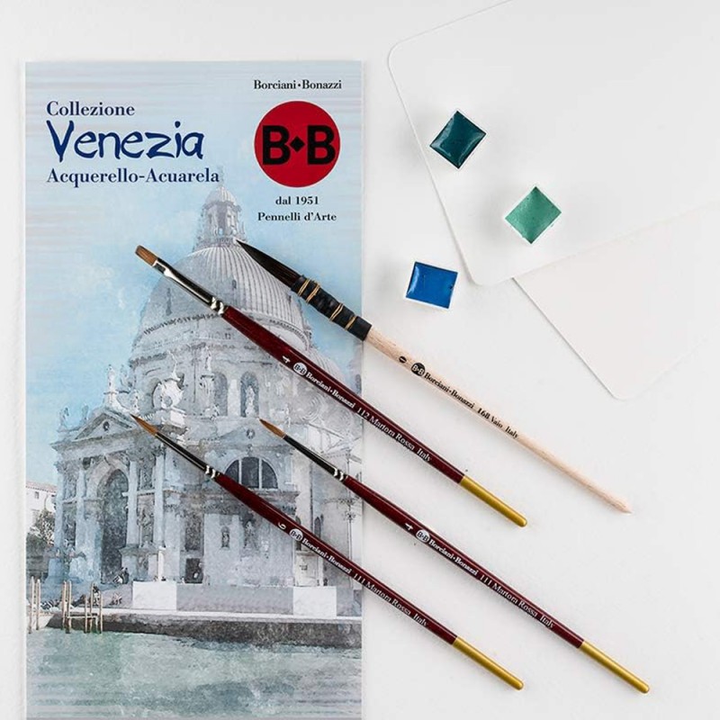 Set Collezione Venezia di Borciani e Bonazzi, composto da 4 pennelli in filato naturale; ideale per tecniche ad acquerello! Il Set è confezionato in astuccio PVC trasparente richiudibile e riutilizzabile.