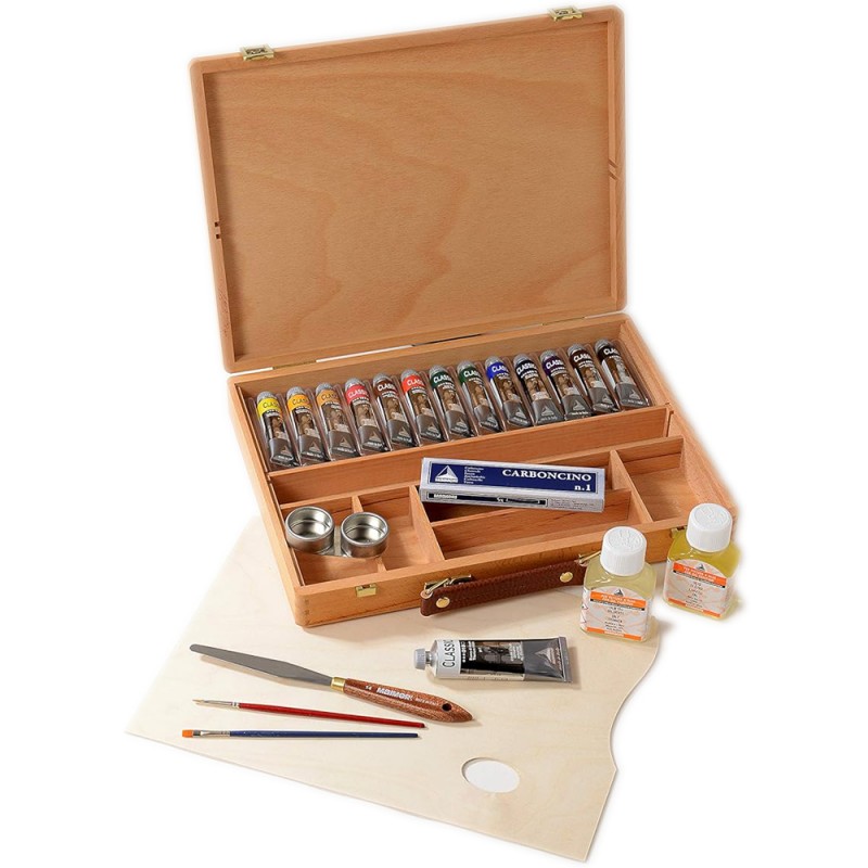 •13 tubetti assortiti 20ml, •Bianco di titanio 60ml, •Olietto diluente 75ml, •Olio di lino 75ml, •1 astuccio di carboncino, •2 pennelli sintetici, •scodellino doppio in metallo, •spatola a coltello, •tavolozza e divisori in faggio.