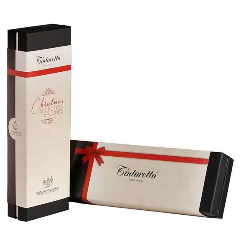 Elegante scatola realizzata da Tintoretto composta da tre pennelli, adatti per la pittura ad acquerello; edizione limitata con packaging natalizio edizione 2023.