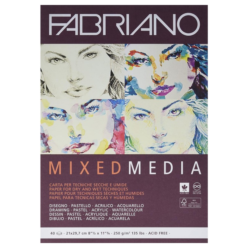 +390823846958Blocco Mixed Media di Fabriano, la carta perfetta per le tecniche miste! La composizione della carta è 100% Alpha-Cellulosa; inoltre è priva di acidi (acid free). Il blocco è composto da 40 fogli da 250gr. collati su un lato. Disponibile nel formato A4.