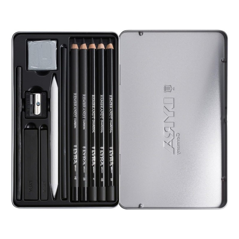 Set Carboncino Lyra Rembrandt, assortimento di carboncini in matita e stick di qualità superiore con mina scorrevole che lascia un segno evidente! Un ottimo equilibrio di diverse gradazioni, completo di mine morbide, medie e dure. Ideali per abbozzo, disegno e schizzi monocromi.