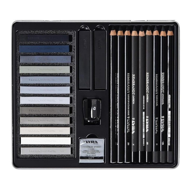 Set Matite Lyra Rembrandt Toni Grigi, il set dedicato a tutti i creativi che non vedono l’ora di sperimentare nuove sfumature! Una confezione in metallo che contiene diverse tipologie di matite carboncino e un assortimento di pastelli morbidi e quadrati con tonalità che vanno dal grigio freddo al grigio caldo per portare in scena uno spettro completo. Ideali per il disegno artistico e lo schizzo.