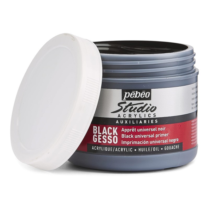 Gesso Nero di Pebeo; adatto per preparare le superfici da dipingere, come tela, cartone e legno. Migliora l'adesione degli strati di pittura acrilica o a olio e si applica su una superficie pulita e non grassa. Disponibile nel formato da 500ml.