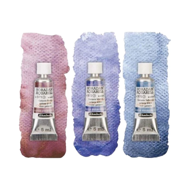 Set Acquerelli Horadam Super Granulati Serie Galaxy di Schmincke; tonalità che richiamano la galassia. Questo set comprende 3 tubetti da 5ml. nelle seguenti tonalità: