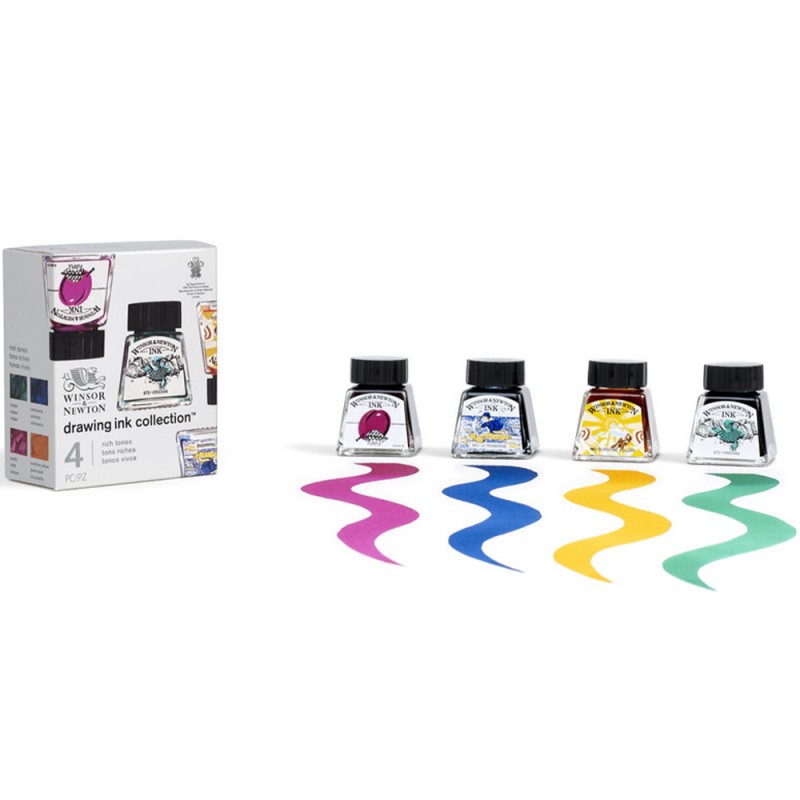 Set Inchiostro Drawing Ink Winsor&Newton, confezione da quattro colori adatti per disegno artistico e illustrazione! Questi inchiostri possono essere applicati con il pennello, il pennino o l'aerografo. I principali vantaggi degli inchiostri da disegno Winsor&Newton sono: colori vividi, essiccazione rapida e impermeabili ad eccezione dell'oro e dell'argento.