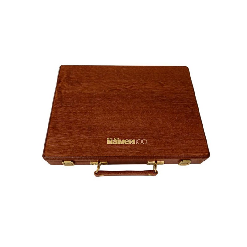 Inoltre, la cassetta offre una tavolozza in legno, un raffinato panno blu per pulire e un tocco di esclusività con un francobollo speciale creato appositamente per il centenario di Maimeri.
