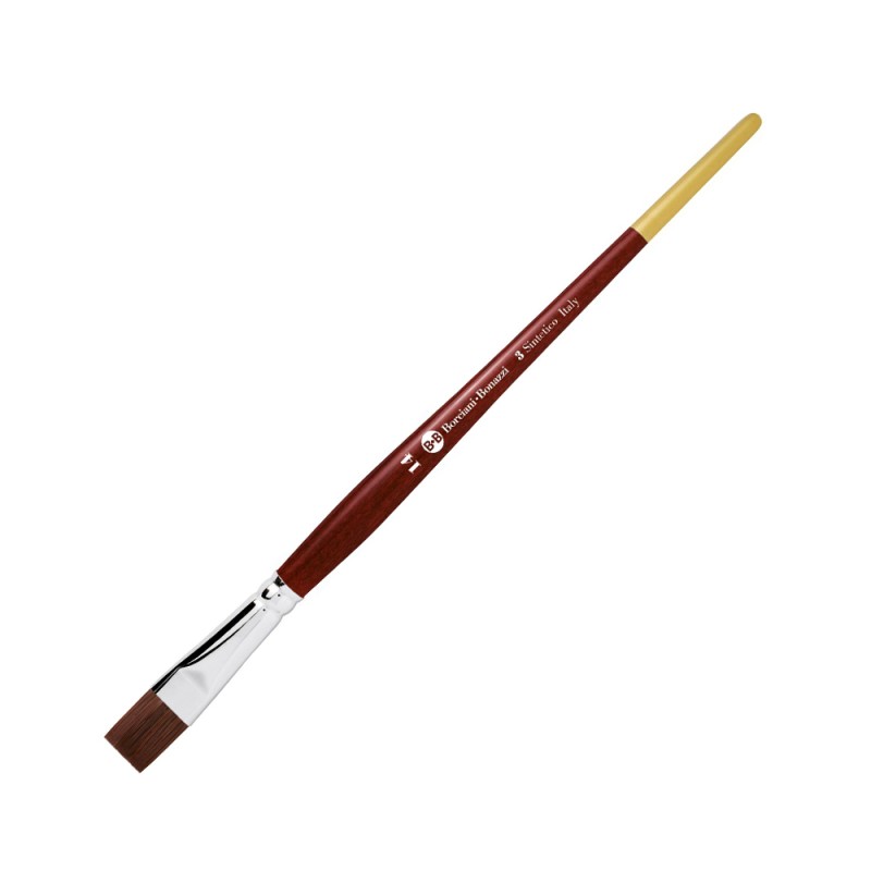 Pennello a punta piatta in filato sintetico Prugna Serie 3 di Borciani e Bonazzi; con manico lungo in legno laccato terra rossa e coda oro, con ghiera in ottone nichelato. Ideale per tecniche pastose e dense, come acrilico ed olio, è adatta per la sua resistenza a decorazioni murali, restauro e con inchiostri e colore diluito per calligrafie a pennello. La pennellata rimane precisa e ben definita anche su supporti grezzi e porosi.