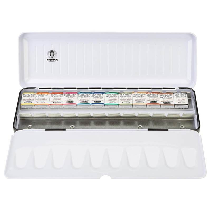 Questa fantastica confezione in metallo di acquerelli Horadam Schmincke contiene ben 12 tinte nel formato mezzo godet: