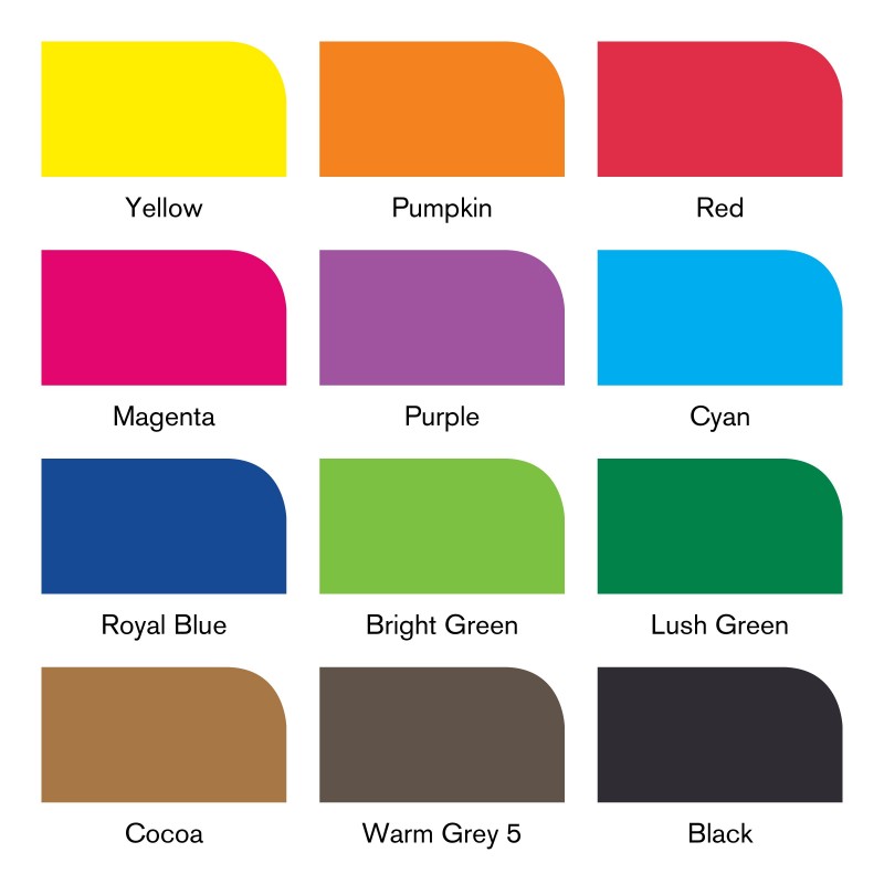 Yellow, Pumpkin, Red, Magenta, Purple, Cyan, Royal Blue, Bright Green, Lush Green, Cocoa, Black
