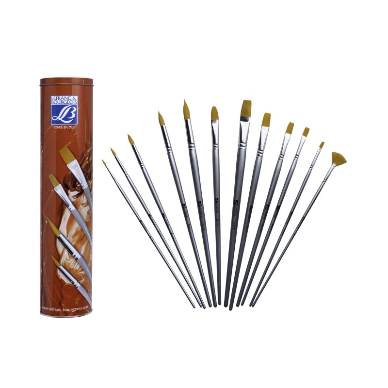 Il set comprende un tubo di metallo decorato. All’interno vi sono 12 pennelli utili per i colori acrilici ed acquerelli.