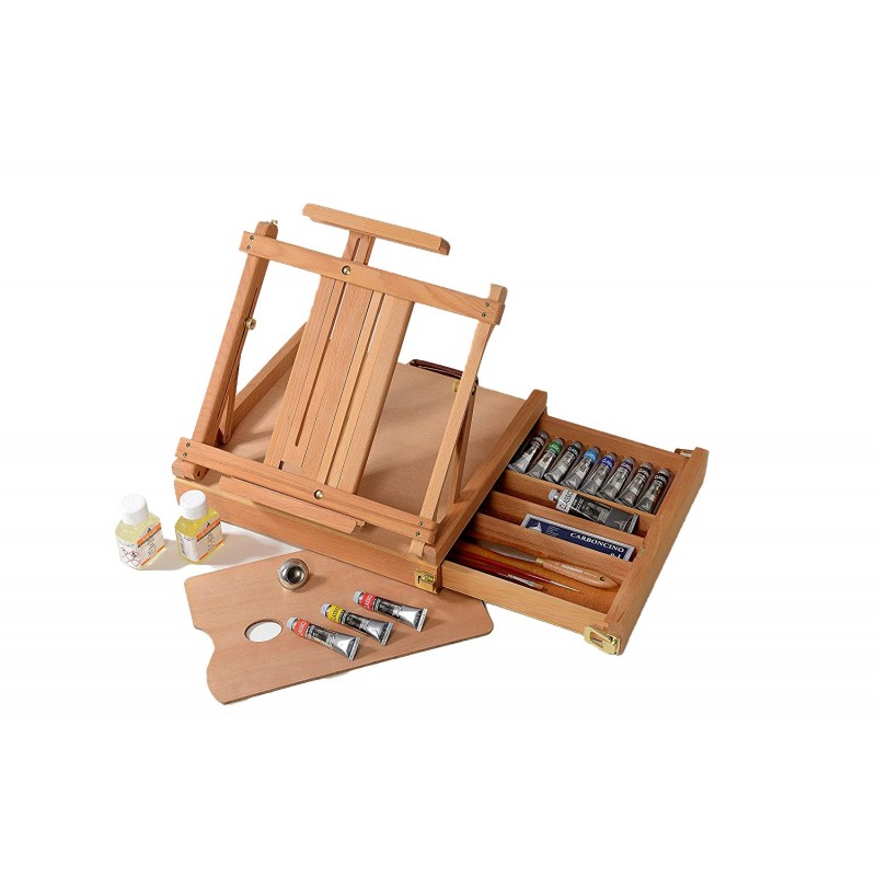 Cassetta cavalletto da tavolo in faggio oliato, ingegnosa, munita di un cassetto laterale che consente di trovare velocemente gli strumenti di lavoro. Angolo di inclinazione regolabile per adattare la posizione di lavoro e sfruttare la luce migliore.