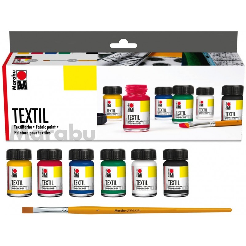 6 Marabu Textil da 15ml. ( Giallo medio, Carminio, Blu medio, Verde intenso, Nero, Bianco)