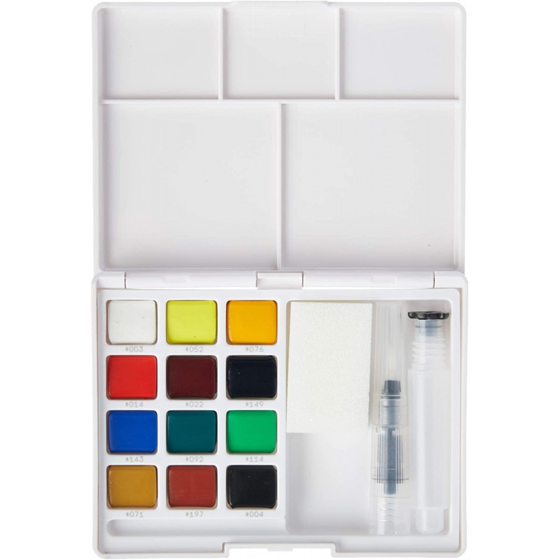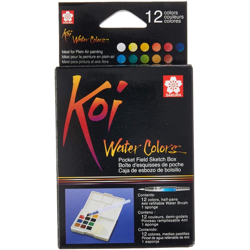 Scatola tascabile di colori ad acquerello con pigmenti appositamente selezionati. La scatola ha un supporto integrato per uso sia destrorso che mancino. Questo set contiene 12 colori assortiti, il pennello riutilizzabile Koi Water Brush, spugna e accessori, infine, include bacinelle di miscelazione nel coperchio del set.
