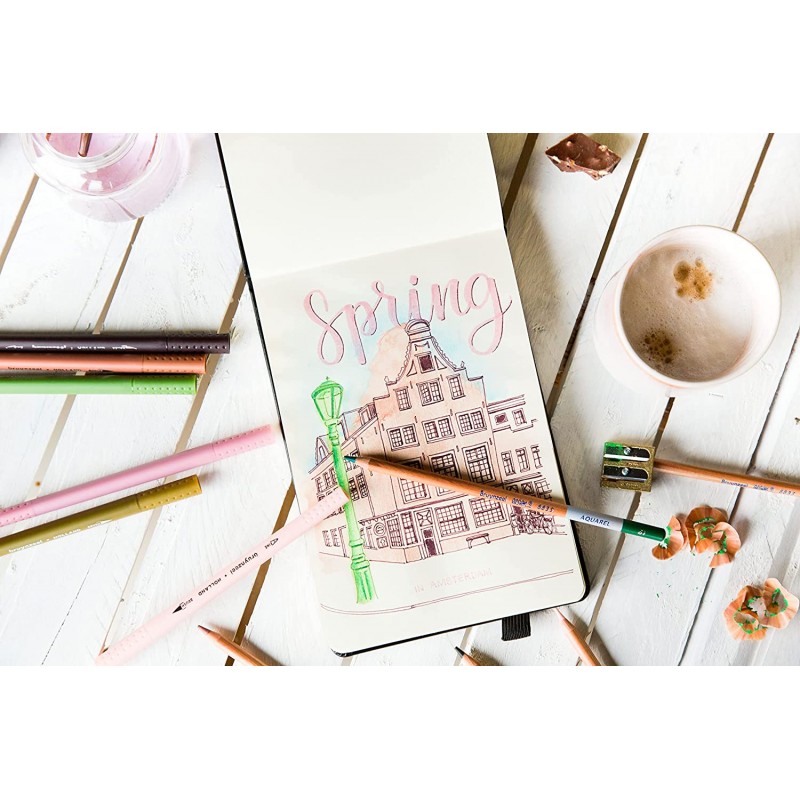 24 matite acquerellabili di alta qualità con un nucleo robusto e spesso di 2,9 mm realizzate con pigmenti di qualità per un buon trasferimento del colore e una completa solubilità in acqua. Può essere applicato sia bagnato che asciutto. Pennello incluso.