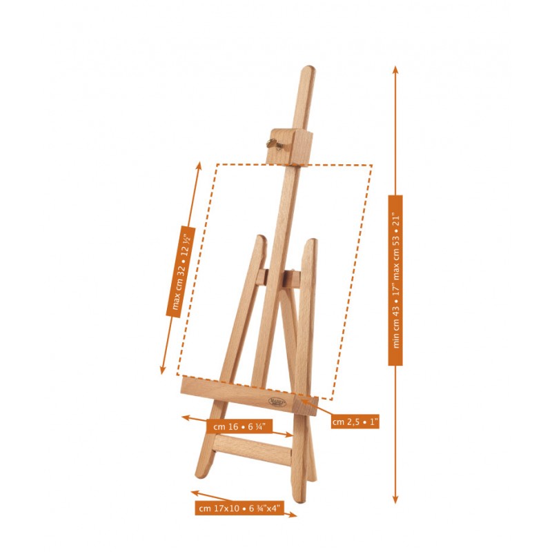 Cavalletto da Tavolo Mabef M/14 realizzato con legno massello di faggio della migliore qualità! Può sostenere una tela di dimensioni massime di 60cmx30cm e peso massimo di 2.5kg.
