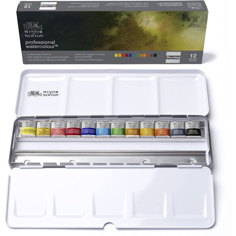 Scatola in metallo con 12 colori acquerello in formato mezzo godet, per un primo approccio alla pittura ad acquerello e cominciare a scoprire il piacere di dipingere.